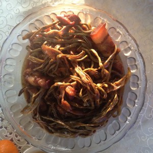 水开后放入干豆角,放入鸡精,盖上锅盖小火炖四十分钟,最后大火收汁即可