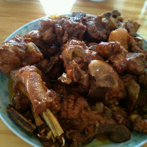 油适量,下排骨,炒的金黄色就可以拿出来,具体情况自己拿捏哦!然后盛出备用。接下热油锅,下蒜片姜丝爆香,接下下排骨,翻炒,然后把调好的汁倒入接着翻炒,最后加水,没过食材