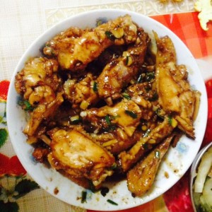 把鸡翅捞出来,把锅里的水倒掉,带锅子热了,把油倒进锅里,待7、8成的时候,把生姜切成片倒入油锅,放盐,放蒜,炒几下,再放入鸡翅,煎成两面都有些焦黄的时候,倒入料酒、老抽、和可乐!可乐为平齐鸡翅或者盖过它为准。