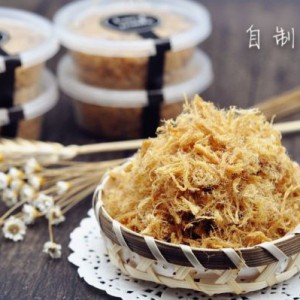 将压扁的猪肉撕成条,好难撕,撕了好久,撕条放入面包机桶,加入调料,用筷子拌匀
