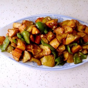 锅里留少许油,依次放入土豆茄子青椒快速翻炒,加少许湿淀粉,快速乘出装盘,OK(少许代表根据自己口味来调,因人口味而异)