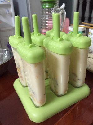 鸡蛋和白沙糖搅拌均匀,加入鲜牛奶用电池炉加热成糊状,注意火一定要小,不然很容易焦掉,然后放凉,可以用一个盆装上水,加入冰块然后把奶锅放至盆中等待冷却,这个时候可以把芒果拌成泥状,待奶糊冷后加入芒果泥搅拌均匀,