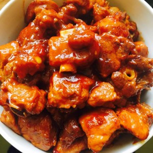 西红柿划痕开水烫俩分钟,去皮剁碎,待排骨炒干全部上色时加入。