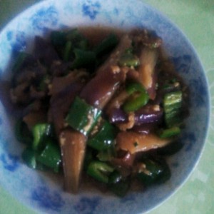 爆炒蒜末,把青椒,鸡精放入翻炒,加入之前焖好的茄子,葱,翻炒,出锅