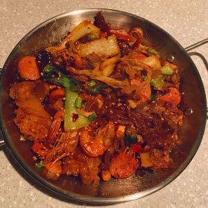 倒入剩余食材(除了粉条或面还有花生米),继续翻炒均匀,加入白糖翻炒,可以再放勺蚝油,郫县豆瓣酱本身我觉得就咸就没再放盐和酱油了