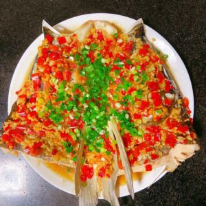 帮热油淋在鱼头身上撒上葱花,淋上热油。