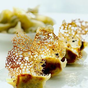 等的有点心急吧,全程需要几分钟,慢慢的面粉水里的水蒸发掉了,出现了好看的冰花孔洞,看看图片上的冰花部分是不是有点白,说明里面还有水,这样还不行,等着都变成金黄色就可以了,轻轻碰一下饺子,饺子轻松和锅子分离,慢慢取出饺子,就成功了