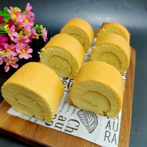 切掉四边不规则部分,借助擀面杖将蛋糕片卷起。