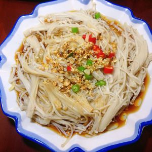 将调好的酱汁均匀的淋入金针菇,然后温油加入蒜末,炒制金黄,最后将热油淋入金针菇。搅拌一下就可以开吃了。