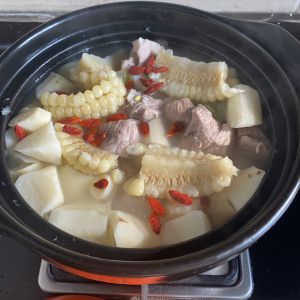 待排骨煮到时间加入山药玉米煮20分钟左右,加入盐调味。
