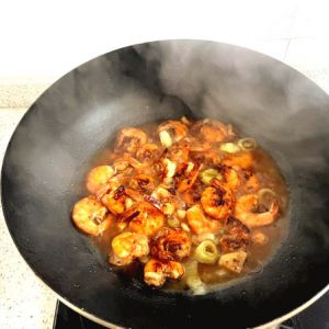 我比较喜欢先用油把五香八角之类的大料煎下(立马捞掉),然后放入虾炒熟,最后用水焖汁出锅。