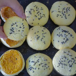 然后放入烤盘进预热好的烤箱,上下火170度烤20分钟,出炉我们的南瓜饼就做好了。