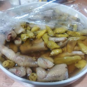 过好水的鸡爪切三段,装进大碗里加入香糟卤和泡椒(水)。淹没鸡爪为宜。