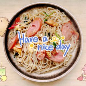 再加火腿,翻炒一会儿,将面加入,加入少许味极鲜(提鲜,增味),最后加入番茄和青菜翻炒熟即可。