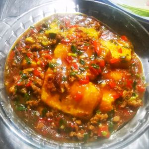 倒入食用油,下肉沫炒香,加入料酒适量的水、生抽、耗油青红辣椒,加入生粉(勾芡)小葱。淋到装盘的豆腐上完成。