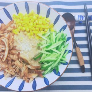 把鸡丝,玉米粒,黄瓜丝依次摆入碗中