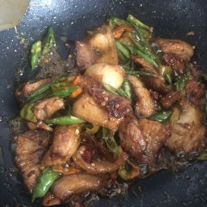 加入青红椒、我用的是线椒也可以用蒜苗煸炒均匀撒入少许白糖提味