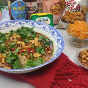 大蒜剁碎,小葱切粒,辣椒面、白芝麻、葱伴侣6月香豆瓣酱,一起放碗里,浇入6勺热油,搅拌均匀。