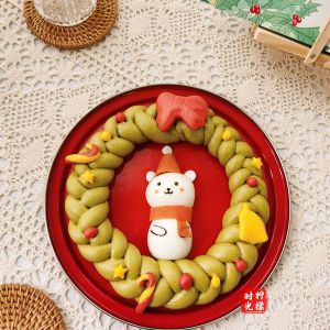用黄色面团和红色面团做装饰,点缀在花环其他位置。