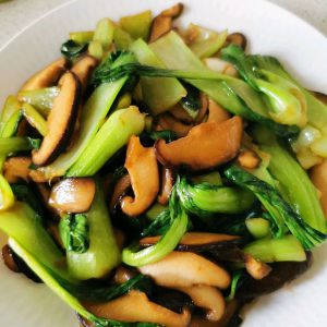 另起锅加少量油,油温4成热放蒜瓣,放油菜翻炒几下,放入刚刚炒好的香菇继续翻遍,放少许生抽,盐,耗油翻炒