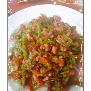 6.翻炒至四季豆变色,放盐加少许水焖煮3―5分钟