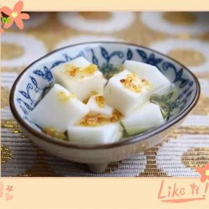 吃的时候,切成小块。撒上桂花蜜,就可以啦