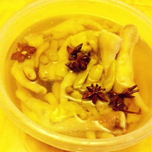 将凤爪捞出后用凉水冲洗干净,放入容器中(怕腥的朋友也可以像小灏子一样把八角,花椒一起捞出来放入容器中的哦!)