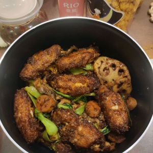 加入炸好的鸡翅,莲菜,平菇,青菜,火腿片。翻炒一下。