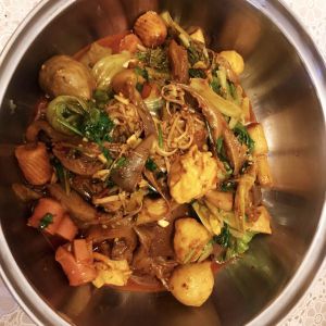加入煮好的鱼丸,蘑菇翻炒,最后加入鸭血,生菜,蒜末翻炒,洒上芝麻,出锅前加入香菜。
