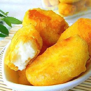 锅内入油(油量根据锅子大小以能完全没过牛奶为准),小火烧热,将沾裹好面糊的牛奶块放入,注意轻轻翻动以防粘连。