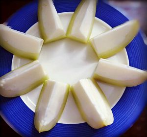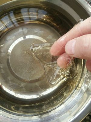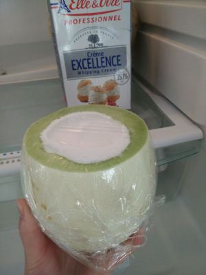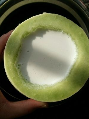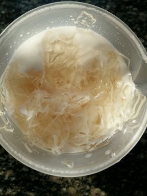 待椰汁晾至温热时放入泡软的吉利丁片(泡好的吉利丁片挤干水分)搅至吉利丁片全部溶化