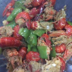 加油入小龙虾爆炒2分钟,加料酒,生抽,少许糖,加入龙虾黄,水煮3分钟,最后加青椒,3分钟后起锅。