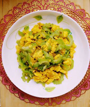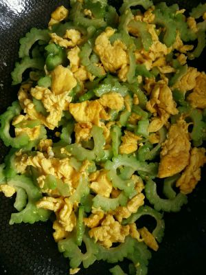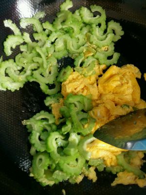 生抽和盐放进去后翻炒半分钟就可以关火了。好吃。苦瓜的苦味和鸡蛋的香味,搭配起来还不错。