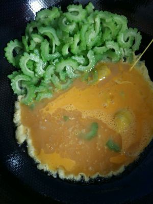把苦瓜弄到一边,然后倒入鸡蛋液。