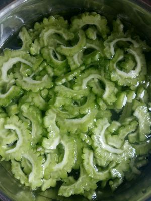 苦瓜一根,洗净,切开去除里面的瓤,切成薄薄的片。在水里泡一会,去除一部分苦味。苦瓜的苦味是不能完全去除的。