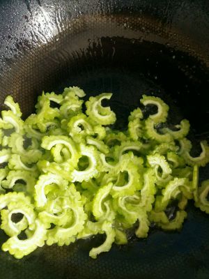 锅里倒入少量花生油,油五分热倒入苦瓜,翻炒2分钟