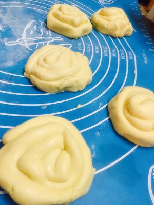 把每一份面团搓成长条后卷成如图状,再轻轻按压成饼