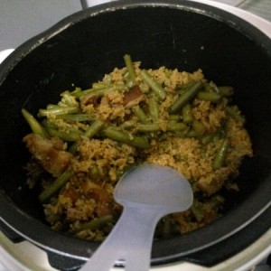 放入电饭锅里,按肉,焖饭开始,别忘记放水哦(⊙o⊙)哦,嘿嘿嘿,跟焖饭一个步骤