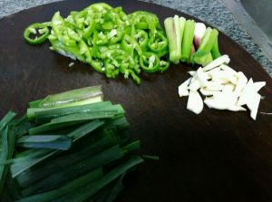 将青椒,蒜头切片,大蒜切段,酸菜切丝