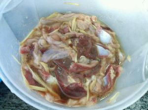 将鸡杂清洗干净,切片,加入姜丝,料酒,盐,酱油,白糖,生粉。