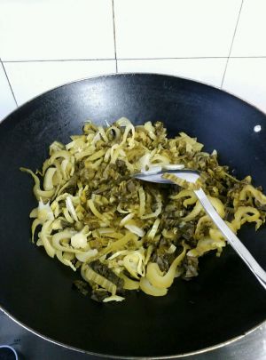 锅内不放油,直接加入酸菜,煸炒至干身,即把酸菜装好备用。