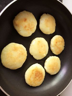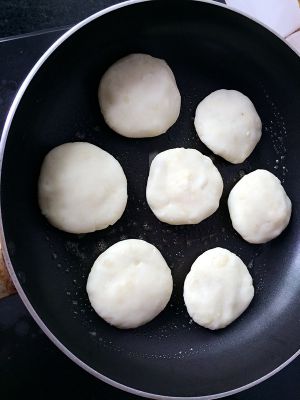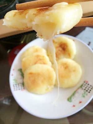 做成大小均匀的圆球、内面包入芝士、压成饼状,放入锅内小火煎
