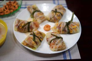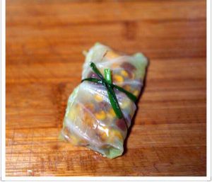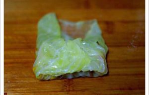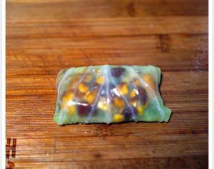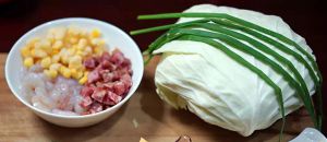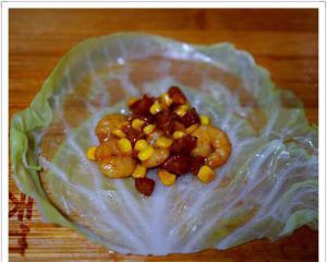 虾仁、火腿丁、玉米小炒调味,白菜叶焯水