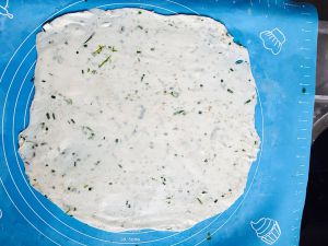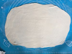 把垫子抹些面粉,取1/4面团,(锅的大的话,取一半面团也可以)擀平