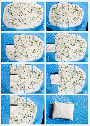 首选把面表面涂一层油,均匀抹上配料.在面皮长边左右两边都开四刀,记住得两边对其.把两边对折,如图最后卷成一个长方形小包包!