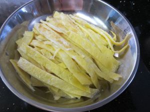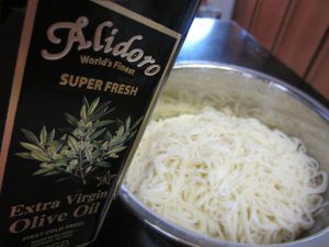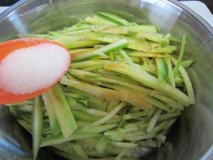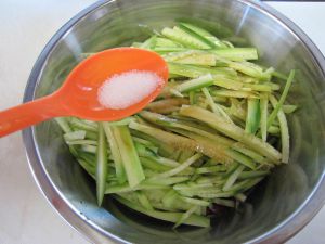 黄瓜去皮切丝,放几滴特级初榨橄榄油。