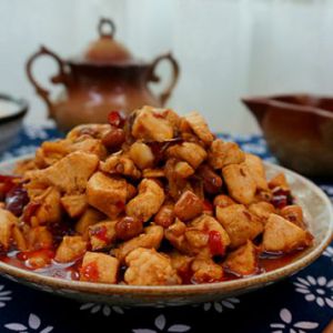 再倒入之前调好的酱汁儿,继续翻炒,直到酱汁完全裹住鸡丁,再加入少许水淀粉勾芡