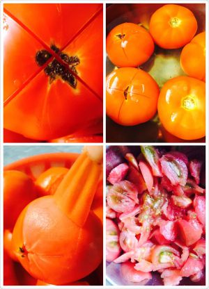 用刀在洗干净的番茄顶部切个十字,放沸水里泡2分钟,撕去皮并切小块。