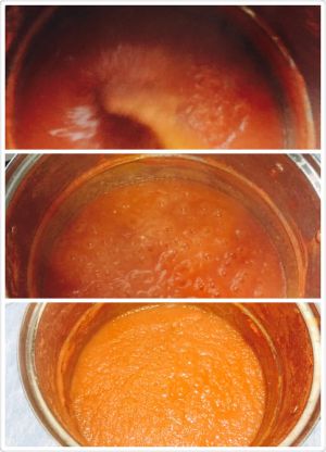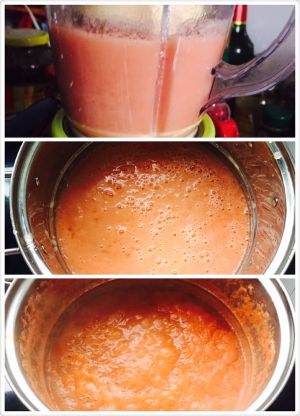 用榨汁机将番茄块打成泥后,倒入不锈钢锅中加白糖,不用加水,大火烧开后转中小熬。