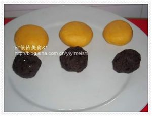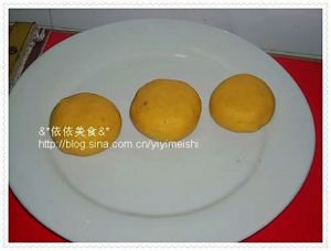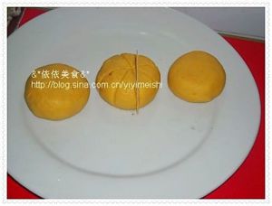 把面团分成大小相当的若干份,红豆沙馅也分成大小相当的若干份:
